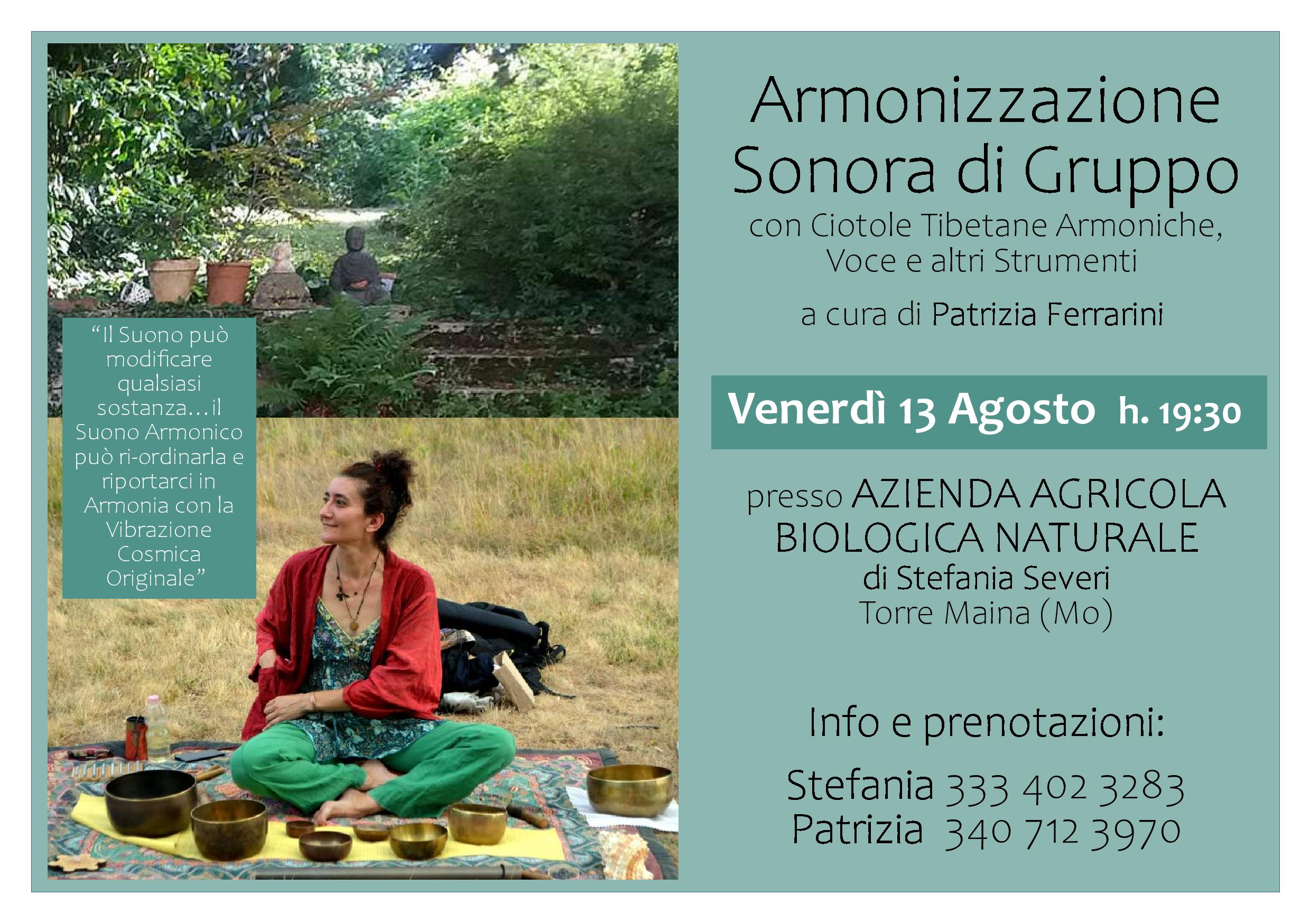 Venerdì 13 agosto – Armonizzazione Sonora di Gruppo @ AZIENDA AGRICOLA BIOLOGICA NATURALE di Severi Stefania – Torre Maina (MO) – Facebook Event: https://www.facebook.com/events/315656090093060